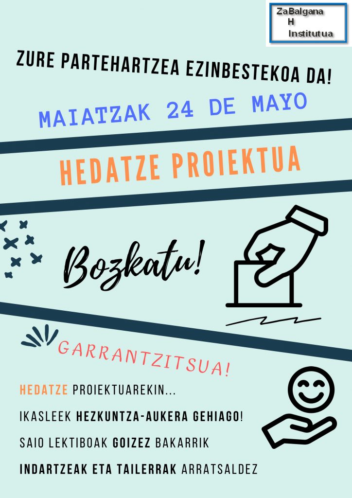 18 Mai 2022 Klaustroak, Ordezkaritza Organo Gorenak eta ikasleek Hedatze proiektuaren ALDE bozkatu dute…! FAMILIAK! Zuen partehartzea EZINBESTEKOA da! Zatozte BOTOA ematera! GUTUNA FAMILIAK BOTOA FAMILIAK BOTO ESKUORDETUA FAMILIAK